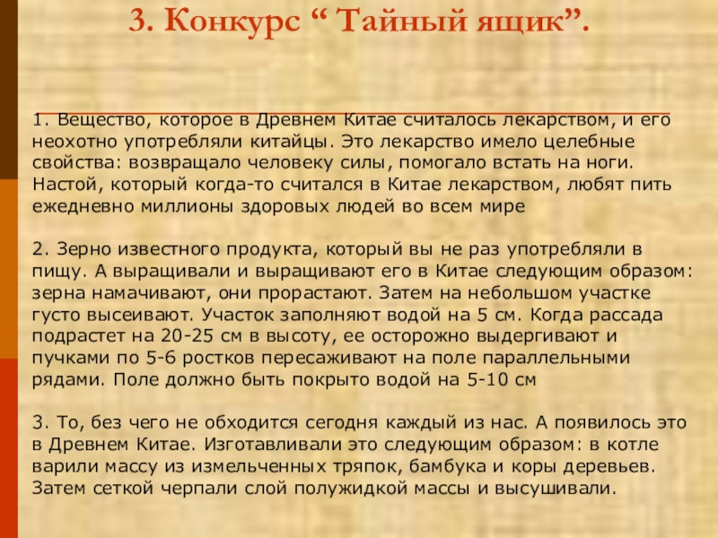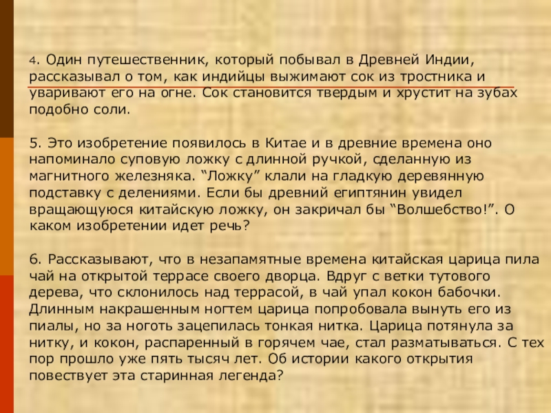 6. Рассказывают, что в незапамятные времена китайская царица пила чай на открытой террасе своего дворца. Вдруг с ветки тутового дерева, что склонилось над террасой, в чай упал кокон бабочки. Длинным накрашенным ногтем царица попробовала вынуть его из пиалы, но за ноготь зацепилась тонкая нитка. Царица потянула за нитку, и кокон, распаренный в горячем чае, стал разматываться. С тех пор прошло уже пять тысяч лет. Об истории какого открытия повествует эта старинная легенда?