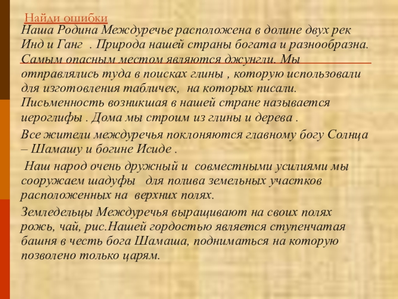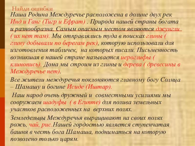 Ганг (Тигр и Ефрат) . Природа нашей страны богата и разнообразна. Самым опасным местом являются джунгли ( их нет там). Мы отправлялись туда в поисках глины ( глину добывали по берегам рек), которую использовали для изготовления табличек, на которых писали. Письменность возникшая в нашей стране называется иероглифы ( клинопись). Дома мы строим из глины и дерева ( древесины в Междуречье нет).