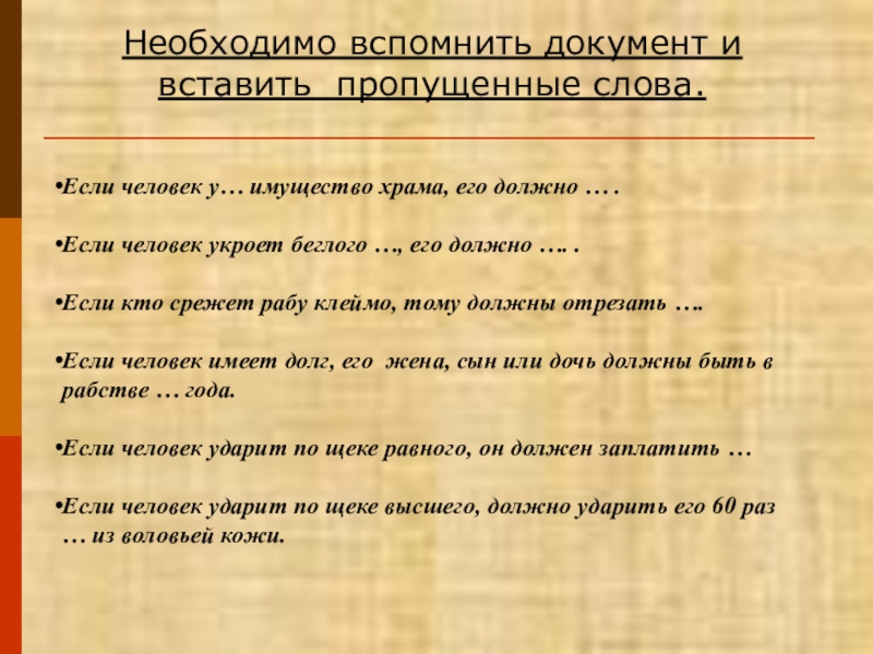 Необходимо вспомнить документ и вставить пропущенные слова.