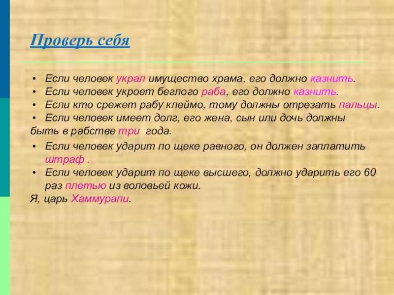 Если человек ударит по щеке высшего, должно ударить его 60 раз плетью из воловьей кожи.