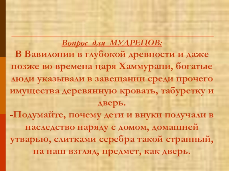 -Подумайте, почему дети и внуки получали в наследство наряду с домом, домашней утварью, слитками серебра такой странный, на наш взгляд, предмет, как дверь.