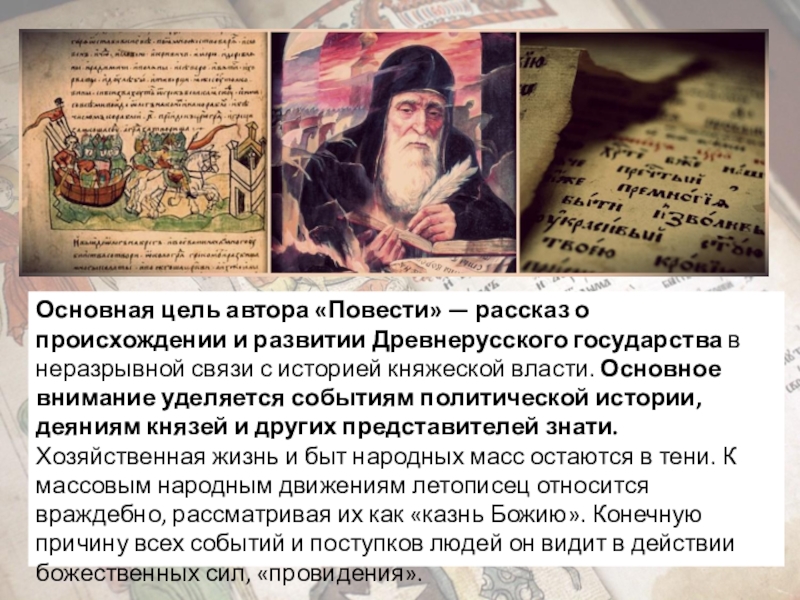 государства в неразрывной связи с историей княжеской власти. Основное внимание уделяется событиям политической истории, деяниям князей и других представителей знати. Хозяйственная жизнь и быт народных масс остаются в тени. К массовым народным движениям летописец относится враждебно, рассматривая их как «казнь Божию». Конечную причину всех событий и поступков людей он видит в действии божественных сил, «провидения».