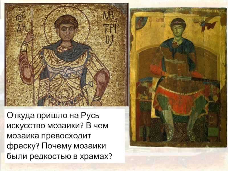 Слайд 38Откуда пришло на Русь искусство мозаики? В чем мозаика превосходит фреску?