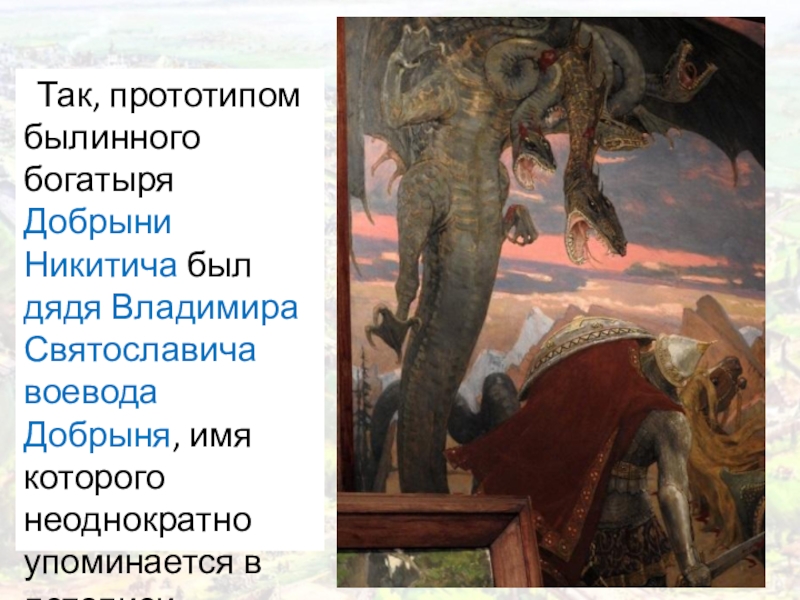 Слайд 10 Так, прототипом былинного богатыря Добрыни Никитича был дядя Владимира