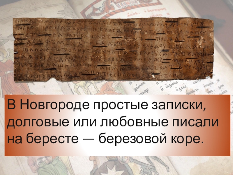 Слайд 21В Новгороде простые записки, долговые или любовные писали на бересте —