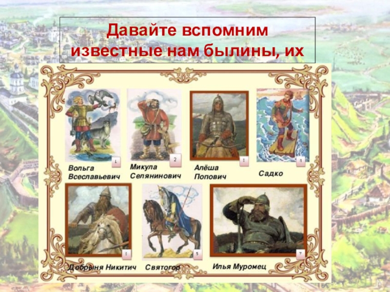 Слайд 13Давайте вспомним известные нам былины, их героев?