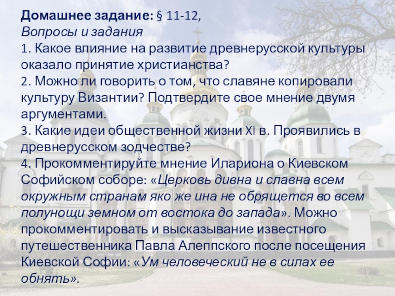 4. Прокомментируйте мнение Илариона о Киевском Софийском соборе: «Церковь дивна и славна всем окружным странам яко же ина не обрящется во всем полунощи земном от востока до запада». Можно прокомментировать и высказывание известного путешественника Павла Алеппского после посещения Киевской Софии: «Ум человеческий не в силах ее обнять».