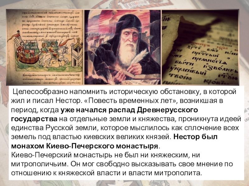 Слайд 29 Целесообразно напомнить историческую обстановку, в которой жил и писал Нестор.