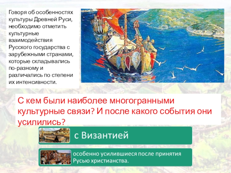 отметить культурные взаимодействия Русского государства с зарубежными странами, которые складывались по-разному и различались по степени их интенсивности.
