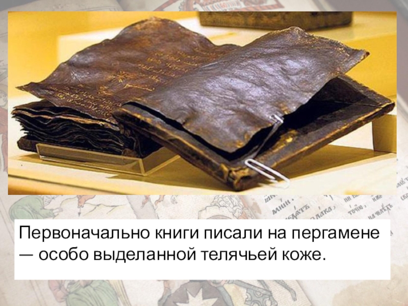 Слайд 20Первоначально книги писали на пергамене — особо выделанной телячьей коже.
