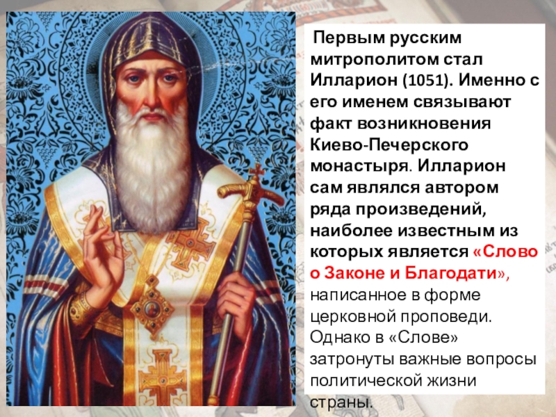 Слайд 30 Первым русским митрополитом стал Илларион (1051). Именно с его именем