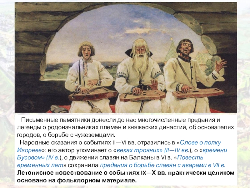 Народные сказания о событиях II—VI вв. отразились в «Слове о полку Игореве»: его автор упоминает о «веках трояних» (II—IV вв.), о «времени Бусовом» (IV в.), о движении славян на Балканы в VI в. «Повесть временных лет» сохранила предания о борьбе славян с аварами в VII в. Летописное повествование о событиях IX—Х вв. практически целиком основано на фольклорном материале.