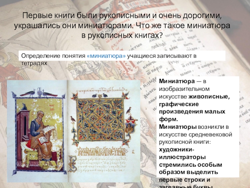 Слайд 19Первые книги были рукописными и очень дорогими, украшались они миниатюрами. Что