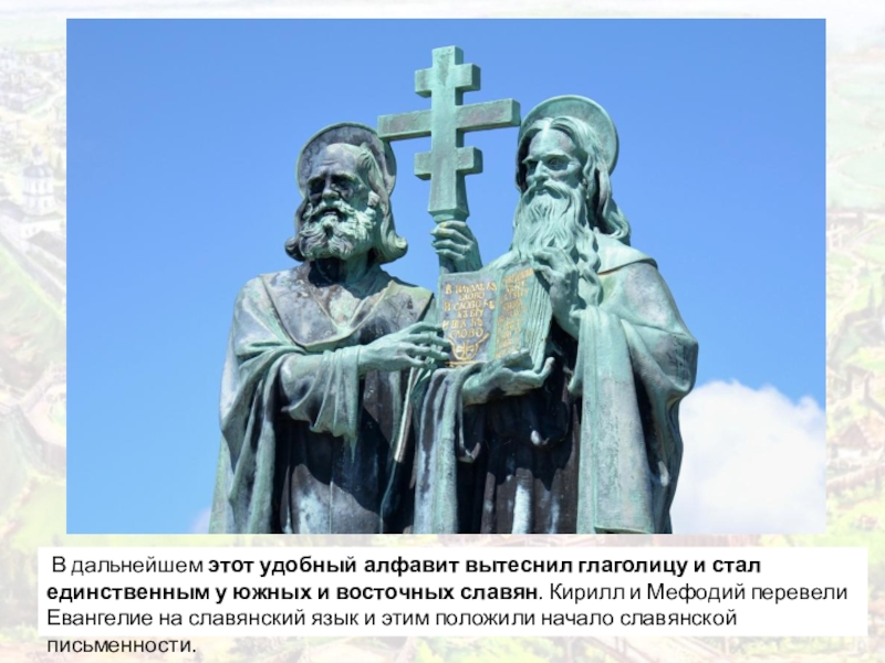 у южных и восточных славян. Кирилл и Мефодий перевели Евангелие на славянский язык и этим положили начало славянской письменности.