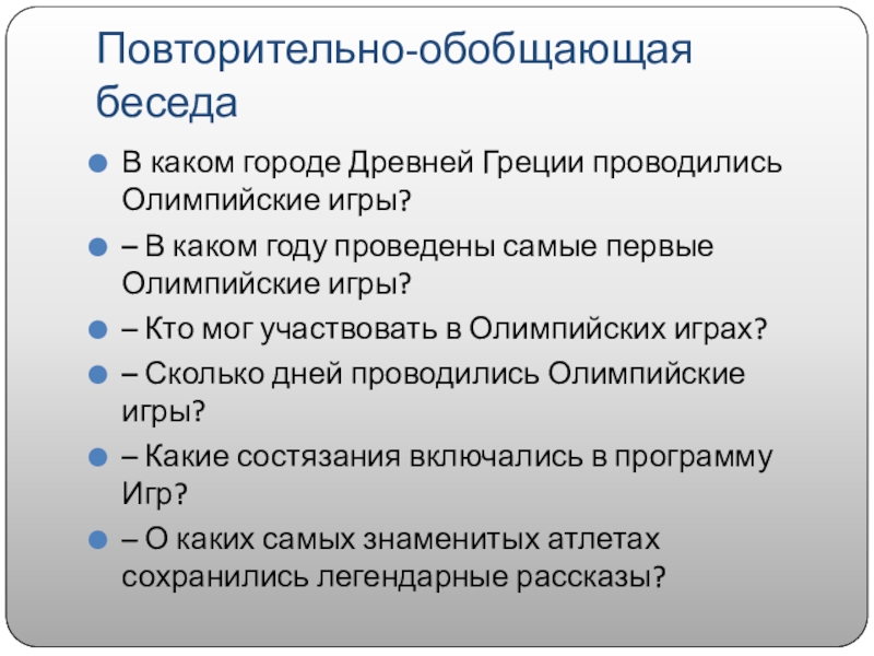 Повторительно-обобщающая беседаВ каком городе Древней Греции проводились Олимпийские игры? – В каком году проведены самые первые Олимпийские