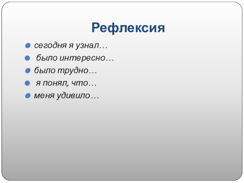 Рефлексиясегодня я узнал… было интересно…было трудно…  я понял, что… меня удивило…