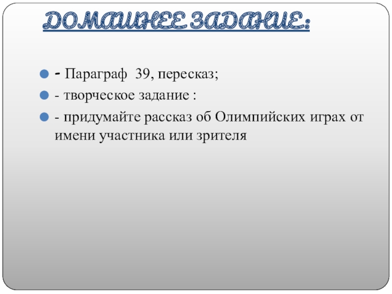 ДОМАШНЕЕ ЗАДАНИЕ:  - Параграф 39, пересказ; - творческое задание : - придумайте рассказ об Олимпийских играх