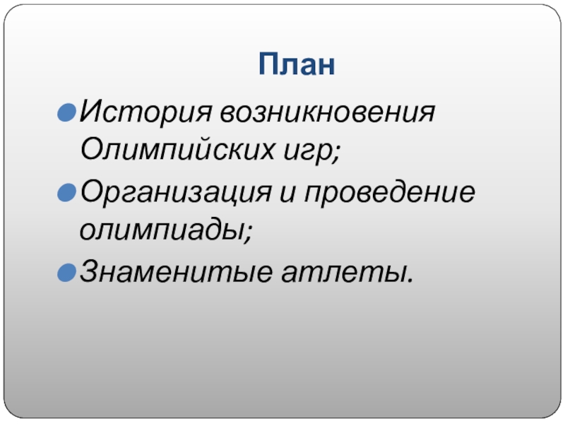ПланИстория возникновения Олимпийских игр;Организация и проведение олимпиады;Знаменитые атлеты.