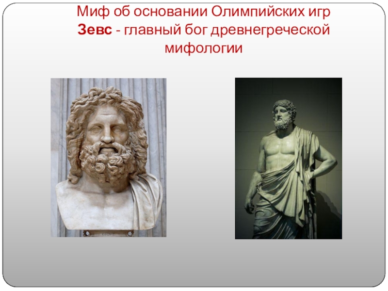 Слайд 10 Миф об основании Олимпийских игр Зевс - главный бог древнегреческой мифологии