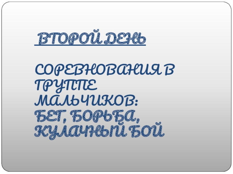 Слайд 16 ВТОРОЙ ДЕНЬ СОРЕВНОВАНИЯ В ГРУППЕ МАЛЬЧИКОВ: БЕГ, БОРЬБА, КУЛАЧНЫЙ БОЙ