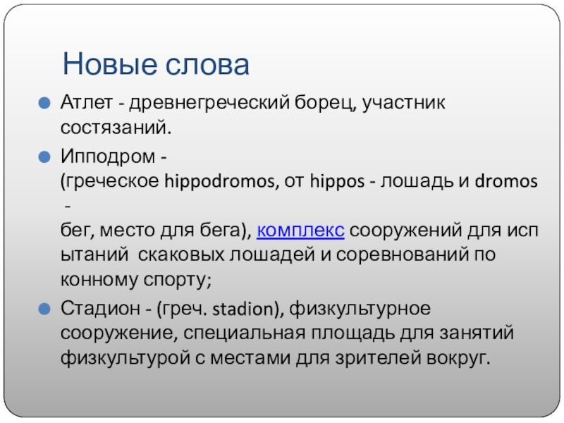 Новые словаАтлет - древнегреческий борец, участник состязаний.Ипподром - (греческое hippodromos, от hippos - лошадь и dromos -бег, место для бега), комплекс сооружений для испытаний  скаковых лошадей и соревнований по конному спорту;Стадион - (греч. stadion), физкультурное сооружение, специальная площадь