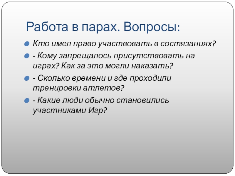 Работа в парах. Вопросы:Кто имел право участвовать в состязаниях?- Кому запрещалось присутствовать на играх? Как за это