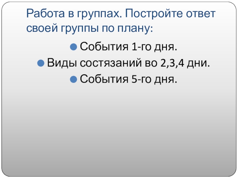 Работа в группах. Постройте ответ своей группы по плану:События 1-го дня.Виды состязаний во 2,3,4 дни.События 5-го дня.