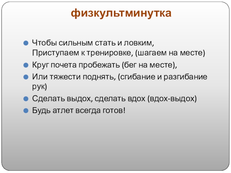 физкультминутка Чтобы сильным стать и ловким, Приступаем к тренировке, (шагаем на месте)Круг почета пробежать (бег на месте),Или