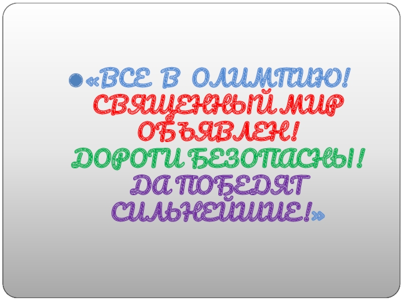 Слайд 7«ВСЕ В ОЛИМПИЮ! СВЯЩЕННЫЙ МИР ОБЪЯВЛЕН! ДОРОГИ БЕЗОПАСНЫ! ДА ПОБЕДЯТ СИЛЬНЕЙШИЕ!»
