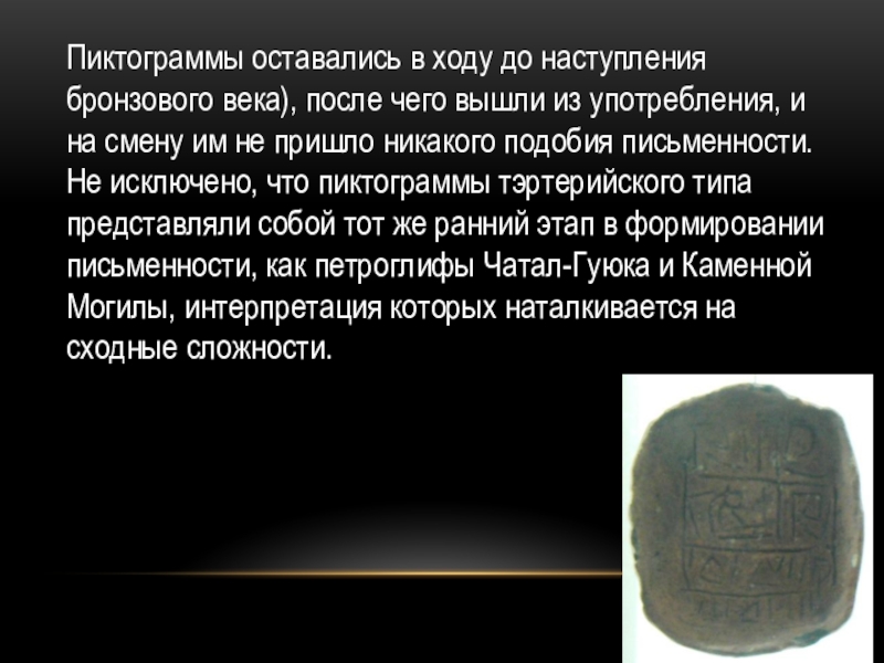 из употребления, и на смену им не пришло никакого подобия письменности. Не исключено, что пиктограммы тэртерийского типа представляли собой тот же ранний этап в формировании письменности, как петроглифы Чатал-Гуюка и Каменной Могилы, интерпретация которых наталкивается на сходные сложности.