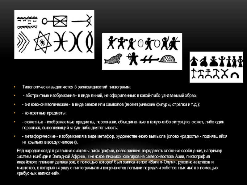 Ряд народов создал развитые системы пиктографии, позволявшие передавать сложные сообщения, например система нсибиди в Западной Африке, «женское письмо» юкагиров на северо-востоке Азии, пиктография индейского племени делаваров, с помощью которой был записан эпос «Валам-Олум», рукописи ацтеков и миштеков, в которых наряду с пиктограммами встречаются попытки передачи собственных имён с помощью «ребусных написаний».