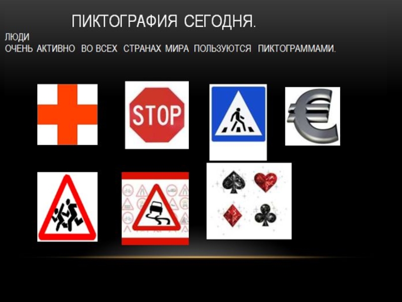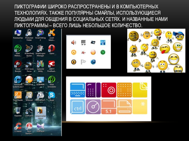 Слайд 20Пиктографии широко распространены и в компьютерных технологиях. Также популярны смайлы, использующиеся