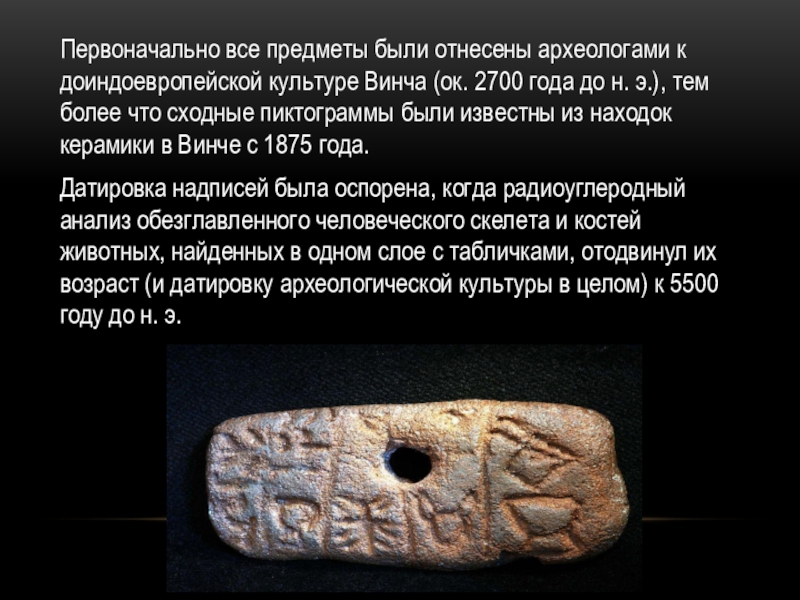 2700 года до н. э.), тем более что сходные пиктограммы были известны из находок керамики в Винче с 1875 года.