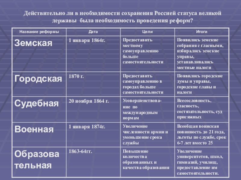 Действительно ли в необходимости сохранения Россией статуса великой державы была необходимость проведения реформ?