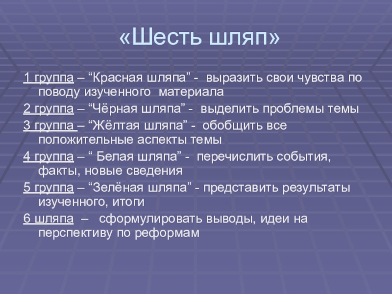 «Шесть шляп» 1 группа – “Красная шляпа” - выразить свои чувства по поводу изученного материала2 группа –