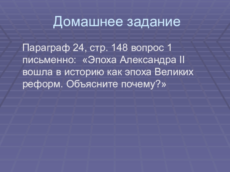 Домашнее задание  Параграф 24, стр. 148 вопрос 1 письменно: «Эпоха Александра II вошла в историю как