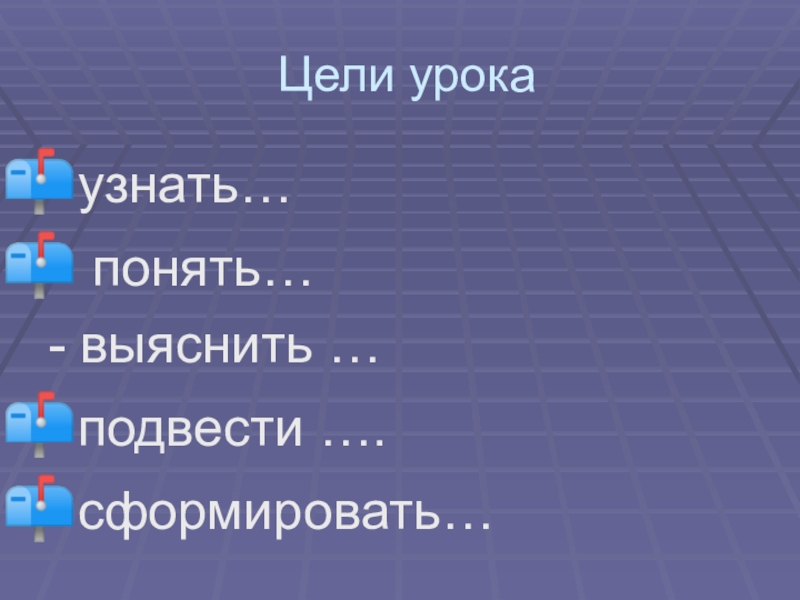 Цели урокаузнать… понять…- выяснить …подвести …. сформировать…