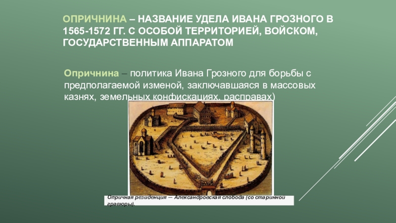 Опричнина – название удела Ивана Грозного в 1565-1572 гг. с особой территорией, войском, государственным аппаратом