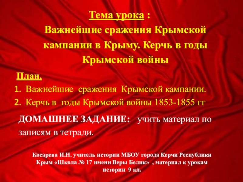 Косарева И.Н. учитель истории МБОУ города Керчи Республики Крым «Школа № 17 имени Веры Белик» , материал к урокам истории 9 кл.