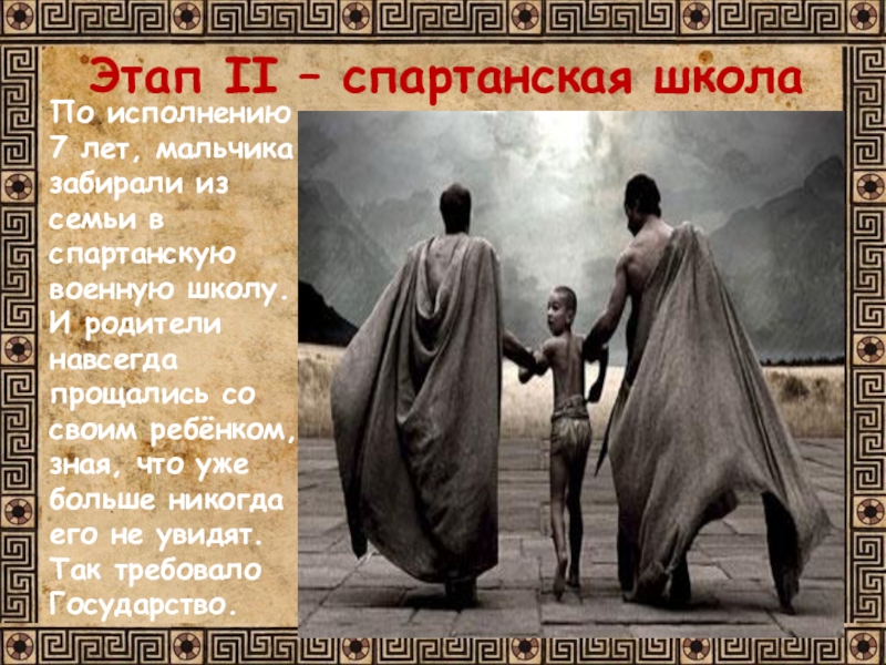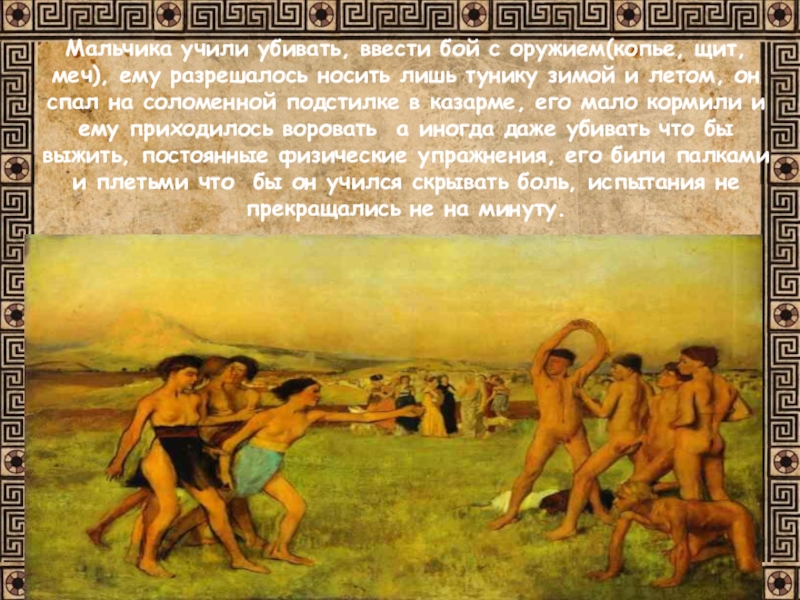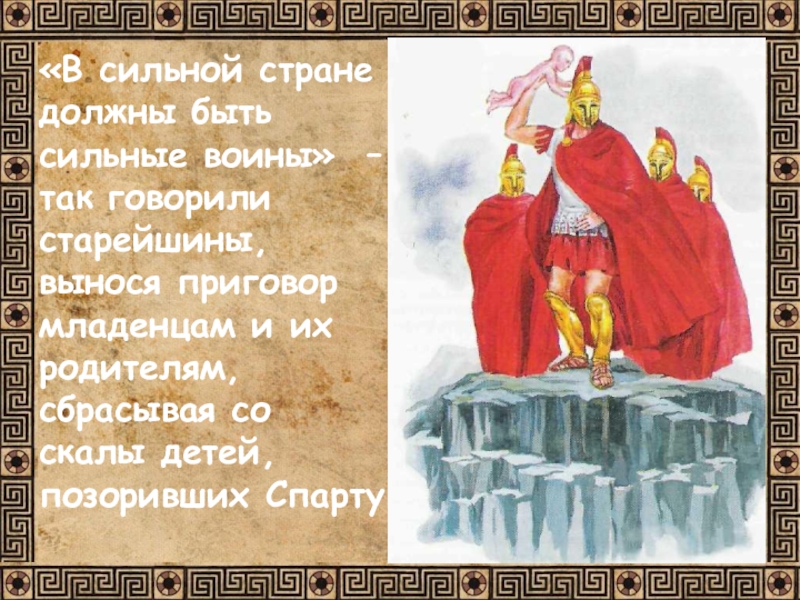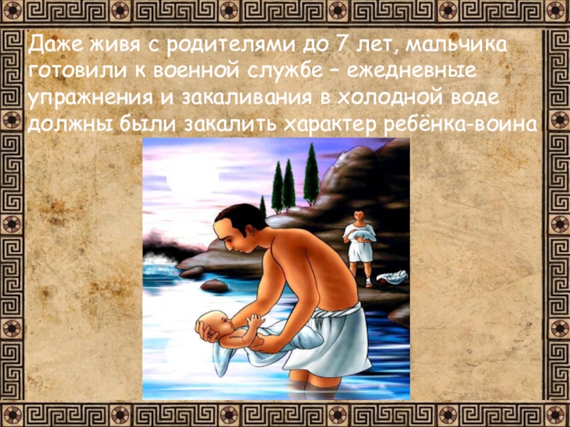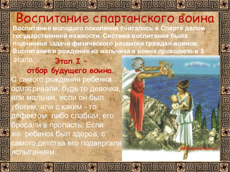 С самого рождения ребенка осматривали, будь то девочка, или мальчик, если он был убогим, или с каким - то дефектом, либо слабым, его бросали в пропасть. Если же ребенок был здоров, с самого детства его подвергали испытаниям.
