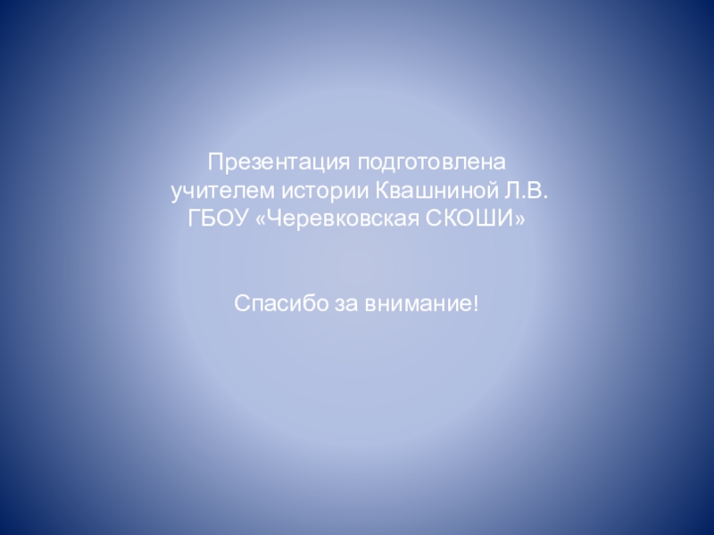Презентация подготовлена   учителем истории Квашниной Л.В. ГБОУ «Черевковская СКОШИ»   Спасибо за внимание!