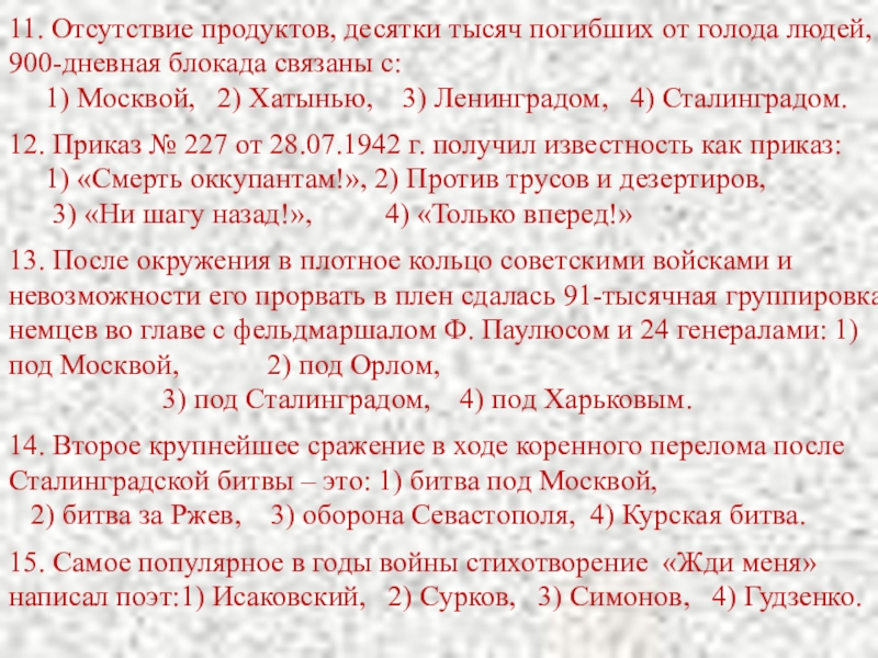 13. После окружения в плотное кольцо советскими войсками и невозможности его прорвать в плен сдалась 91-тысячная группировка немцев во главе с фельдмаршалом Ф. Паулюсом и 24 генералами: 1) под Москвой, 2) под Орлом,