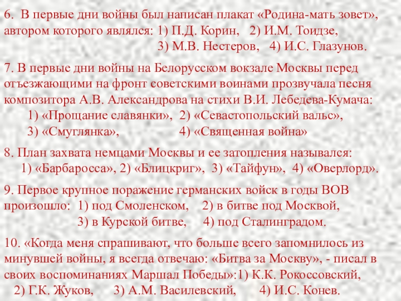 10. «Когда меня спрашивают, что больше всего запомнилось из минувшей войны, я всегда отвечаю: «Битва за Москву», - писал в своих воспоминаниях Маршал Победы»:1) К.К. Рокоссовский,