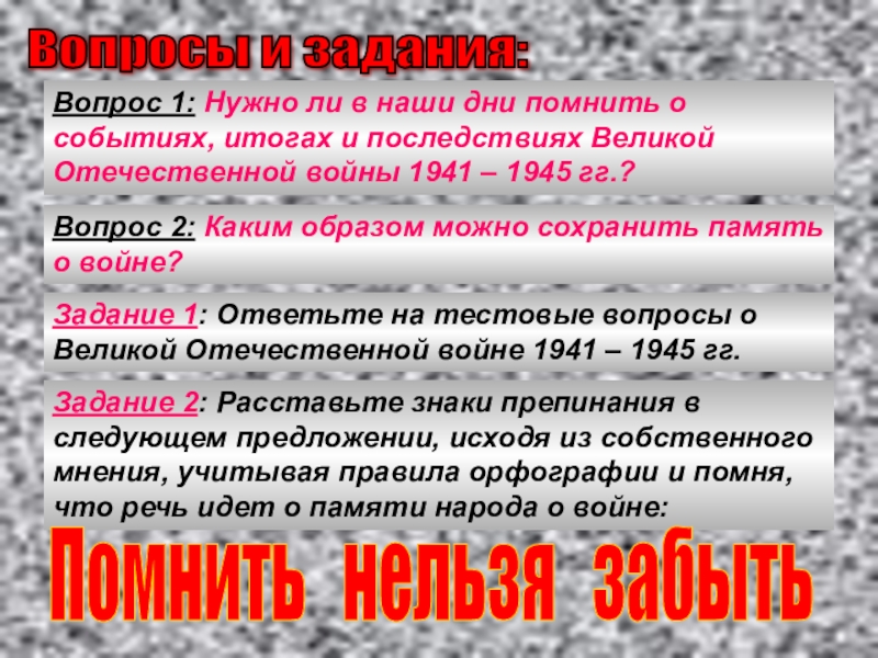 Задание 2: Расставьте знаки препинания в следующем предложении, исходя из собственного мнения, учитывая правила орфографии и помня, что речь идет о памяти народа о войне: