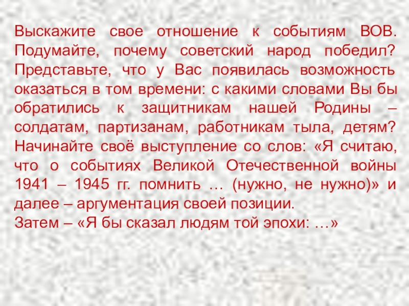 победил? Представьте, что у Вас появилась возможность оказаться в том времени: с какими словами Вы бы обратились к защитникам нашей Родины – солдатам, партизанам, работникам тыла, детям? Начинайте своё выступление со слов: «Я считаю, что о событиях Великой Отечественной войны 1941 – 1945 гг. помнить … (нужно, не нужно)» и далее – аргументация своей позиции.
