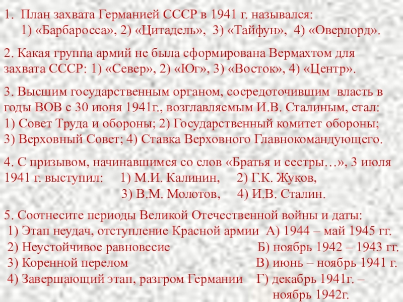 1) «Барбаросса», 2) «Блицкриг», 3) «Тайфун», 4) «Оверлорд».