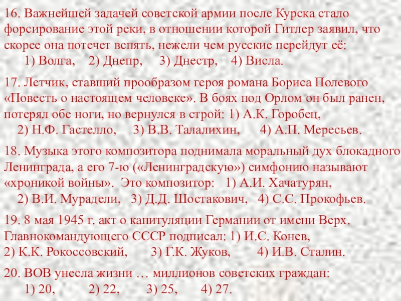 19. 8 мая 1945 г. акт о капитуляции Германии от имени Верх. Главнокомандующего СССР подписал: 1) И.С. Конев,