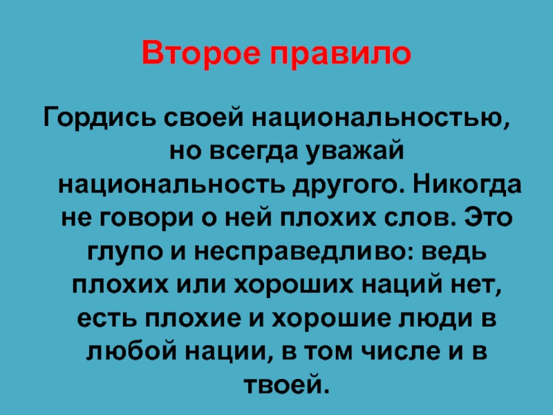 Второе правилоГордись своей национальностью, но всегда уважай национальность другого. Никогда не говори о ней плохих слов. Это