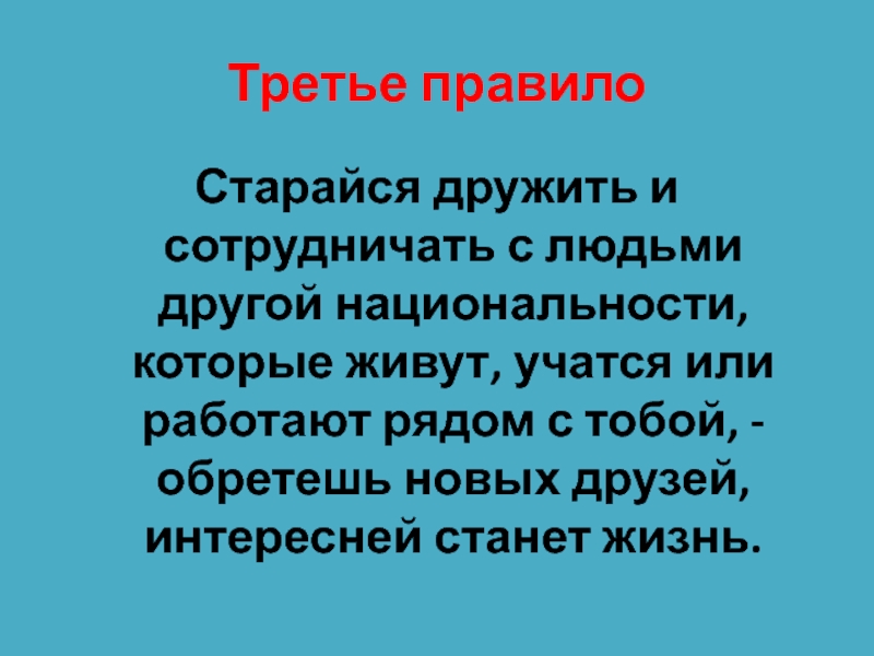 Третье правилоСтарайся дружить и сотрудничать с людьми другой национальности, которые живут, учатся или работают рядом с тобой,