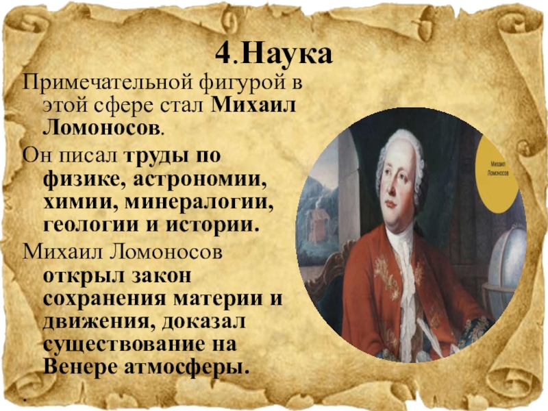 Михаил Ломоносов открыл закон сохранения материи и движения, доказал существование на Венере атмосферы.